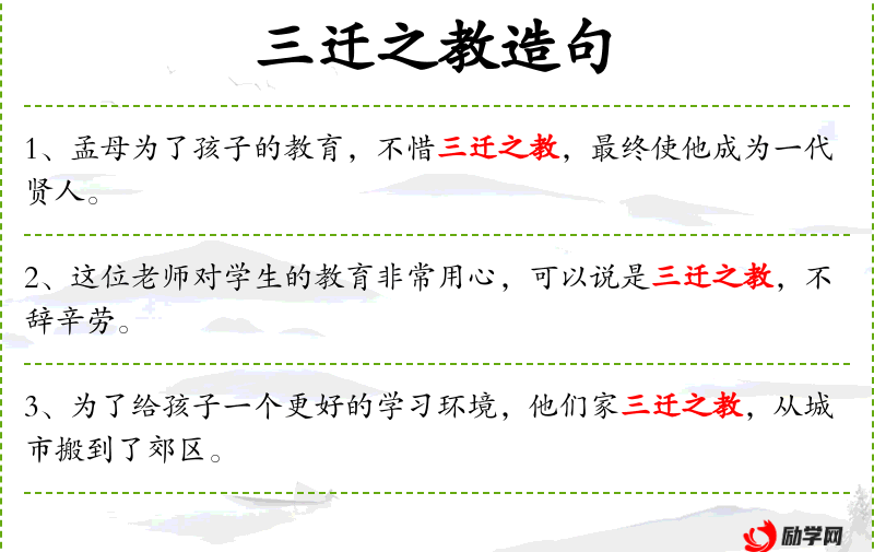 1. 【三迁之教】 - 比喻选择居住合适的环境以利于教育子女。