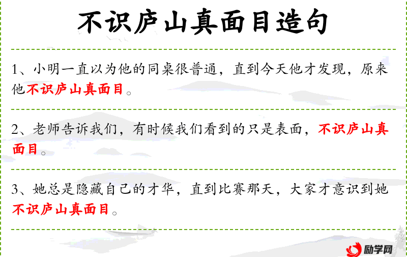 - 不识庐山真面目:这个成语出自宋代苏轼的《题西林壁》,原文是“横看成岭侧成峰,远近高低各不同。不识庐山真面目,只缘身在此山中。”这个成语常用来比喻对事物只看到表面,没有看到本质。