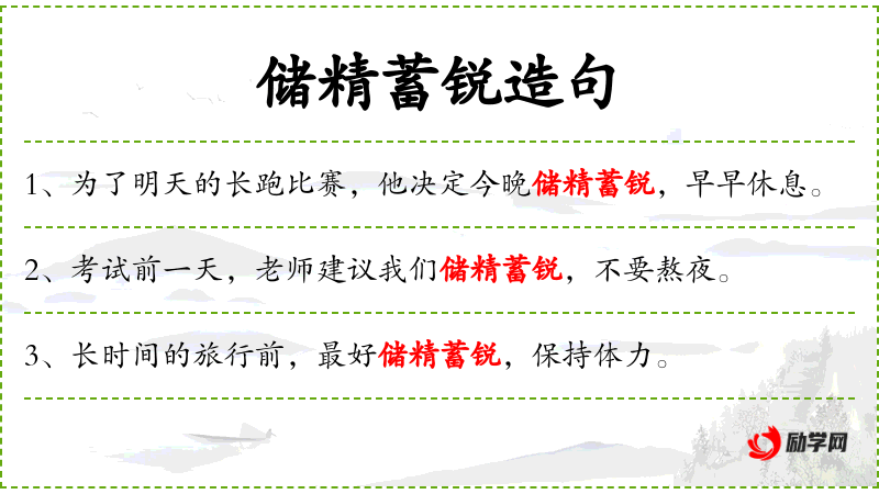 - 储精蓄锐:成语,意思是积蓄精力,准备战斗。