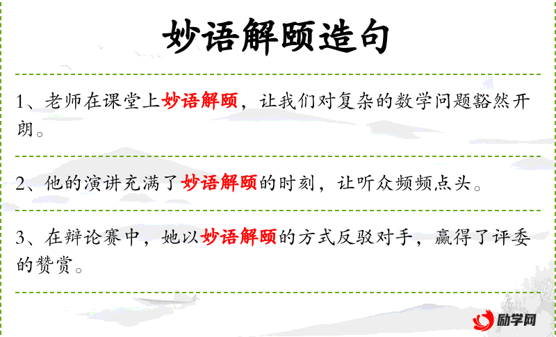 “妙语解颐”是一个成语,源自**传统文化,强调言辞的巧妙和幽默。在辩论赛中使用这样的成语,体现了对传统文化的尊重和运用。