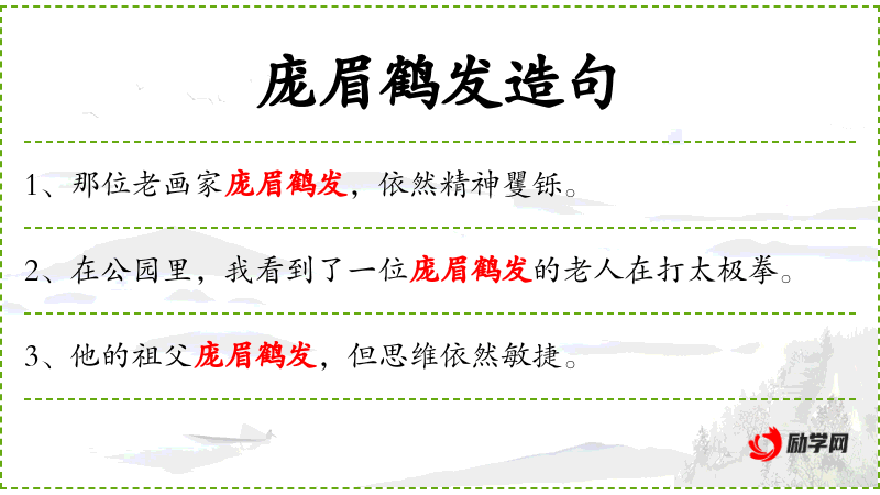 - 庞眉鹤发:这个成语形容老年人外貌特征,常用来赞美老年人的智慧和学识。