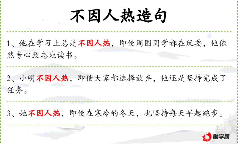 1. 【不因人热】 - 因:依靠。汉时梁鸿不趁他人热灶烧火煮饭。比喻为人孤僻高傲。也比喻不依赖别人。