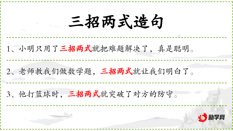 1. 【三招两式】 - 谓武艺不高。招,着数;式,把势,均为武术动作。亦泛指所操之术造诣甚浅。