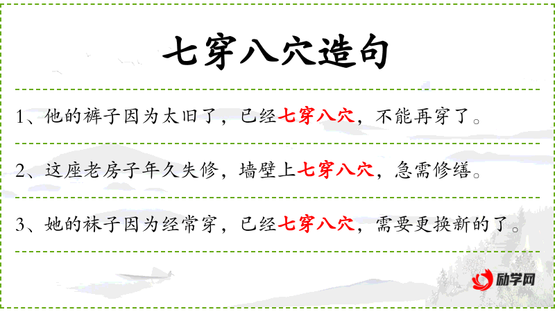 1. 【七穿八穴】 - 穿:洞,孔;穴:窟窿。形容窟窿很多。