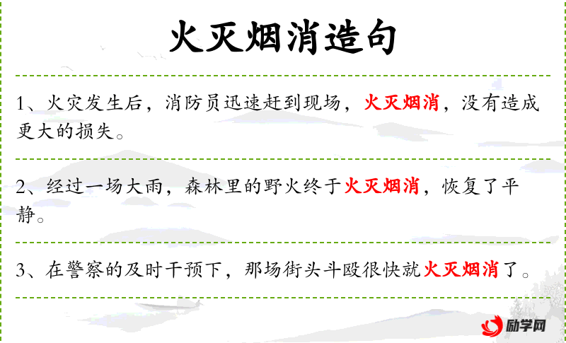 3. 【火灭烟消】 - 火苗熄灭,烟云消散。比喻事物消失净尽,不留一点痕迹。亦作“烟消火灭”。