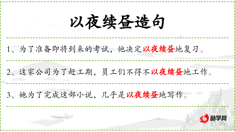 - 宾语:以夜续昼地工作