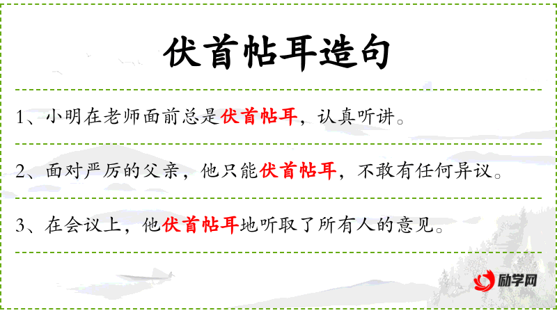 - 每当老师在场,小明总是伏首帖耳,专心致志地听讲。