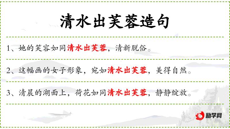 4. 【清水出芙蓉】 芙蓉:荷花的别称。形容诗文清丽,犹如出水的芙蓉一样清新。