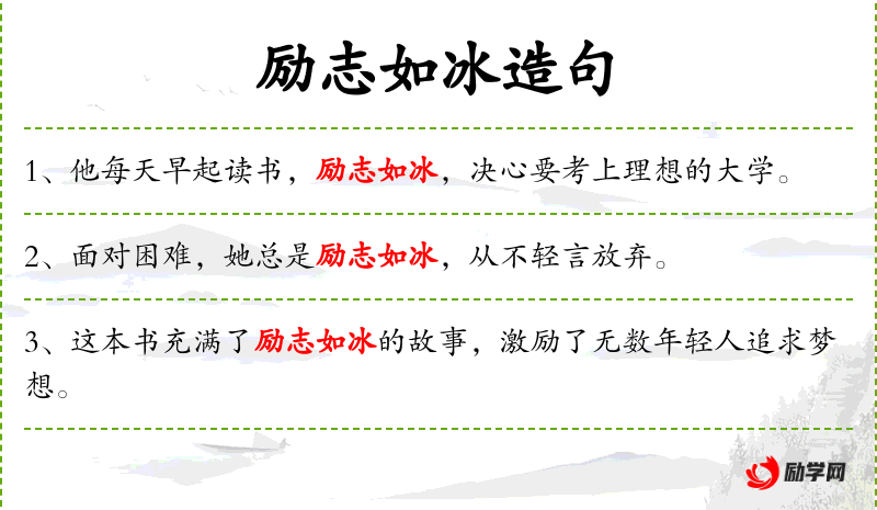 - 不同句式:他立志如冰,每天早起读书,决心要考上理想的大学。