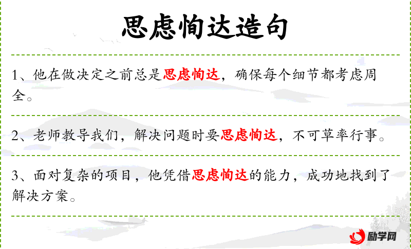 - 思虑恂达:thoughtful and insightful,形容一个人思考问题深入且有洞察力。