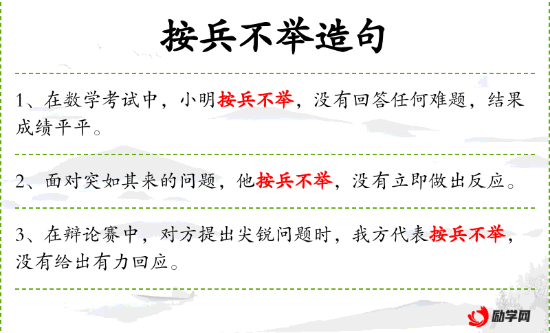 同义词:按兵不举 → 袖手旁观、坐视不理;没有积极参与 → 不投入、不参与。