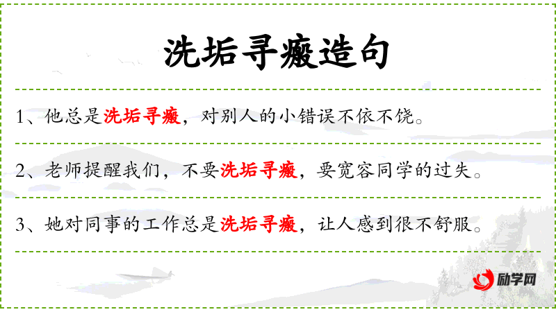 2. 【洗垢寻瘢】 - 垢:污垢;瘢:瘢痕。洗掉污垢来寻找瘢痕。比喻想尽办法挑剔别人的缺点。