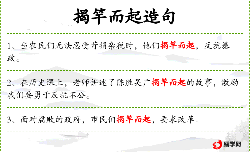 - 陈胜吴广揭竿而起:成语,指陈胜和吴广领导农民起义反抗秦朝暴政的故事。