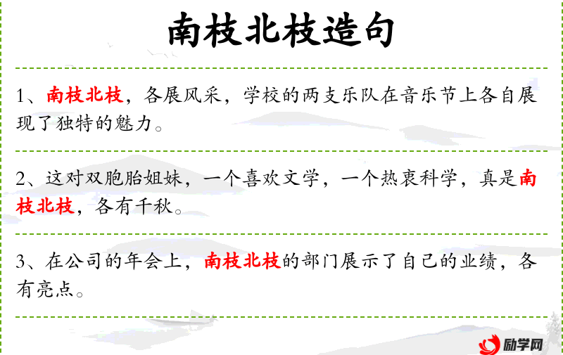 句子:“在公司的年会上,南枝北枝的部门展示了自己的业绩,各有亮点。”