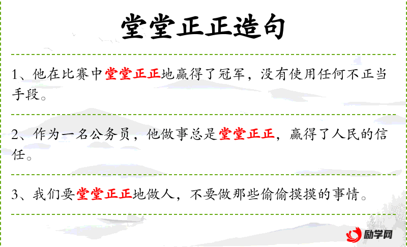 - 堂堂正正:形容词,意为光明正大,不卑不亢。