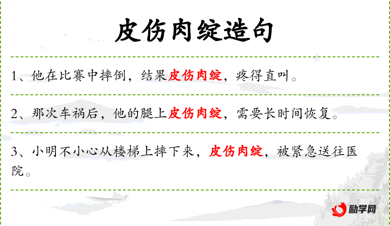 2. 【皮伤肉绽】 - 绽:裂开。皮肉都裂开了。形容被打伤势严重。