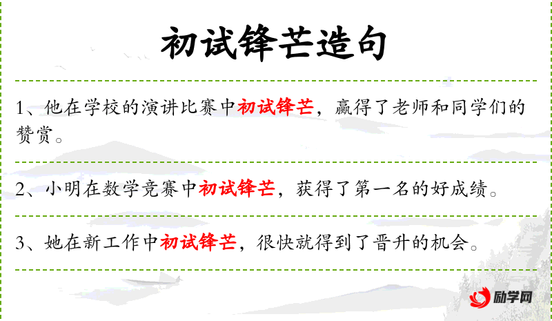 - “初试锋芒”这个成语强调了初次展示的重要性,常用于鼓励年轻人勇敢尝试和展示自己。