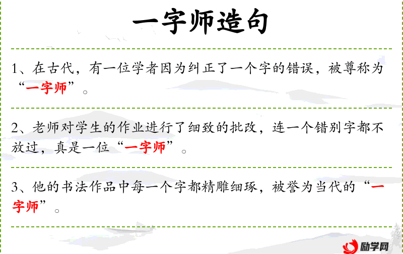 1. 【一字师】 指订正一字之误读,即可为师。亦指更换诗文中一、二字的老师。