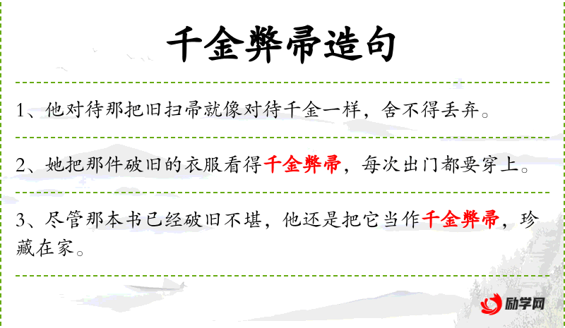 - 千金弊帚:比喻极其珍贵的东西,即使破旧也不舍得丢弃