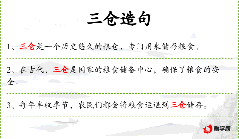 1. 【三仓】 古字书名『初,合李斯《仓颉篇》﹑赵高《爰历篇》和胡母敬《博学篇》为一书,称"三仓",亦统称《仓颉篇》,凡三千三百字。魏晋时,又以李斯《仓颉篇》为上卷,扬雄《训纂篇》为中卷,贾鲂《滂喜篇》为下卷,合为一部,亦称"三仓"。参阅《汉书.艺文志》﹑《隋书.经籍志一》; 指储粮之太仓﹑石头仓﹑常平仓。