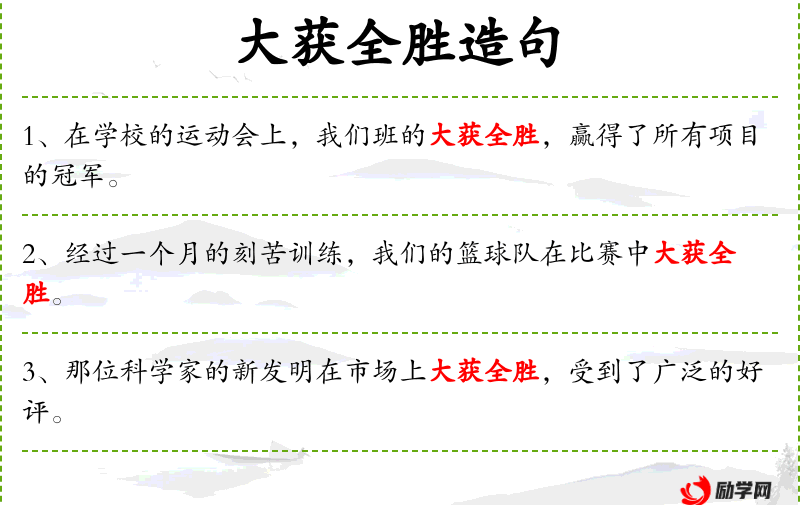1. 【大获全胜】 获:擒获俘虏,夺取敌方辎重;全:完全。形容获得完全的胜利。
