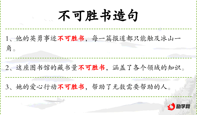 1. 【不可胜书】 不是文字所能写完的。形容要写的事情很多。