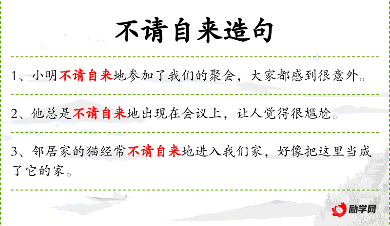 - 不请自来地:表示未经邀请而自行到来。