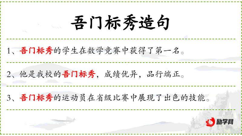 - 吾门标秀:指某人或某事物在自己领域内非常优秀,有“我家的骄傲”之意。