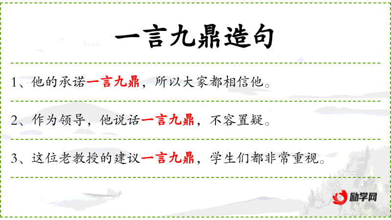 1. 【一言九鼎】 - 九鼎:古代国家的宝器,相传为夏禹所铸。一句话抵得上九鼎重。比喻说话力量大,能起很大作用。