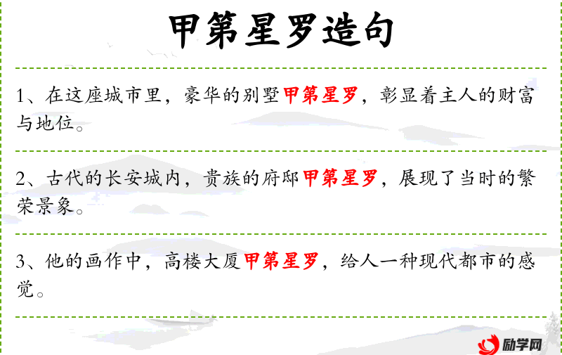 3. 【甲第星罗】 - 甲第:富豪显贵的高级宅第;星罗:象繁星一样排列着。形容富贵人家的宅第极多。