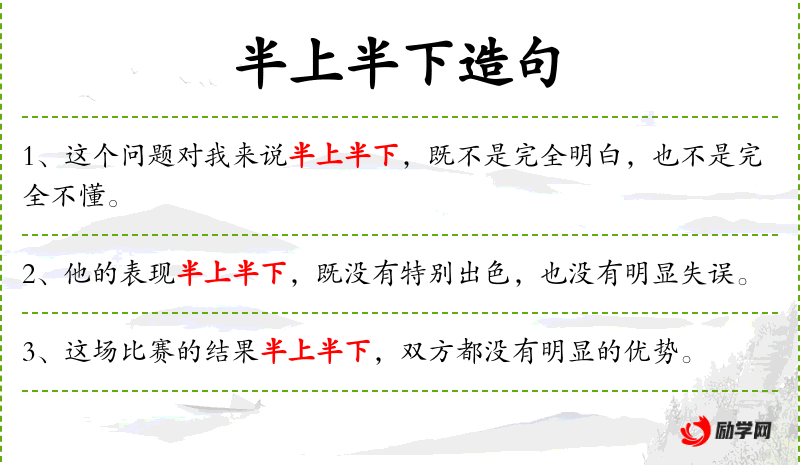 - 半上半下:形容一种中间状态,既不完全也不是完全没有