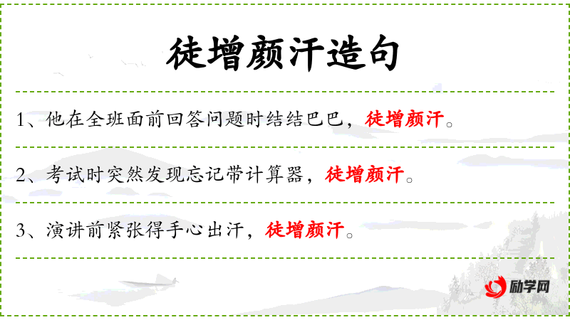 1. 【徒增颜汗】 徒:只;颜汗:脸上的汗水。只是使人羞愧。指对过分的称赞表示不安。