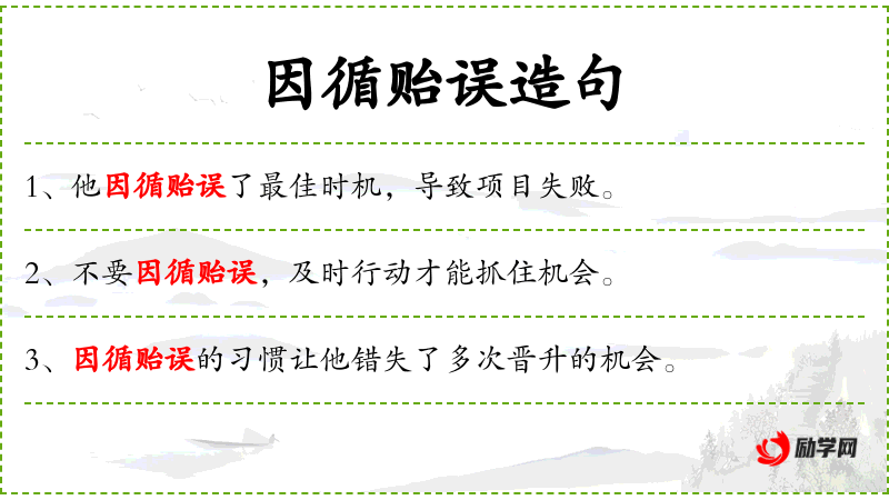 1. 【因循贻误】 因循:沿袭。沿袭旧的一套,使错误也沿袭下去,以至受害。