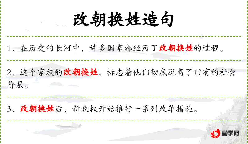 - 改朝换姓:这一表达反映了**历史上朝代更替的频繁,每个新朝代往往伴随着新的统治家族或姓氏。
