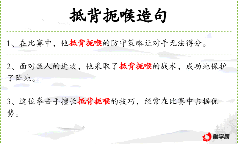 句子:“在比赛中,他抵背扼喉的防守策略让对手无法得分。”