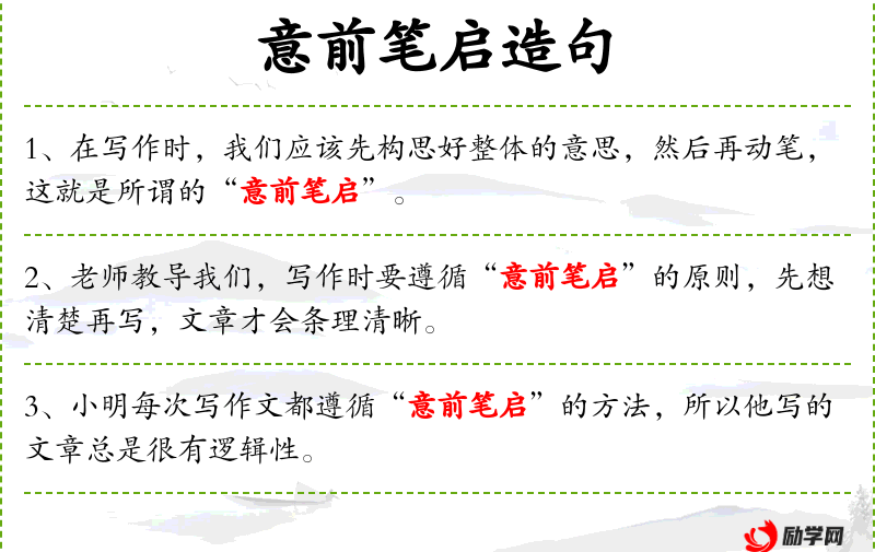 - 意前笔启:这是一个成语,意指在动笔之前先构思好。