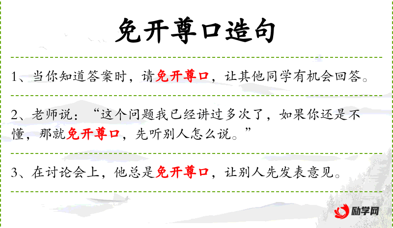 - 免开尊口:成语,表示不发表意见或不参与讨论。