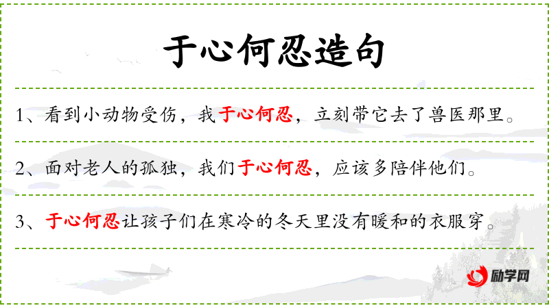 1. 【于心何忍】 怎能忍心。即内心不忍。