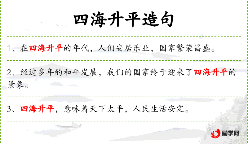 - 宾语:“天下太平,人民生活安定”是宾语,具体说明了“四海升平”所带来的正面影响。