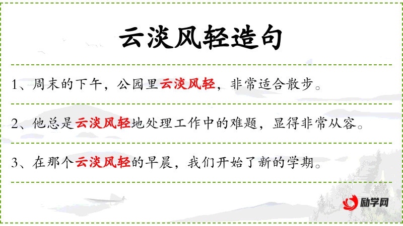 云淡风轻:这个成语源自**传统文化,常用来形容人的心态平和,不急不躁。在现代社会,它常被用来形容人在面对压力或困难时的从容态度。