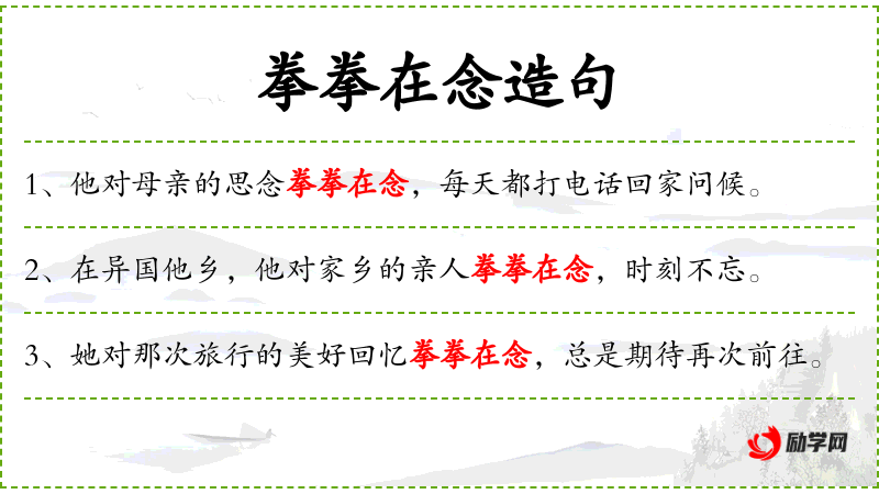 - 拳拳在念:这个成语体现了中文中对梦想执着追求的文化价值观。