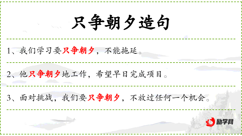 - 只争朝夕:成语,意思是抓紧时间,不放过每一个机会。