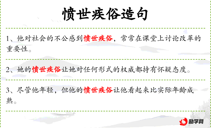 2. 【愤世疾俗】 愤:愤恨,不满;世:世道,现状;疾:通“嫉”,憎恶;俗:世俗。痛恨、憎恶腐朽、黑暗的社会现状