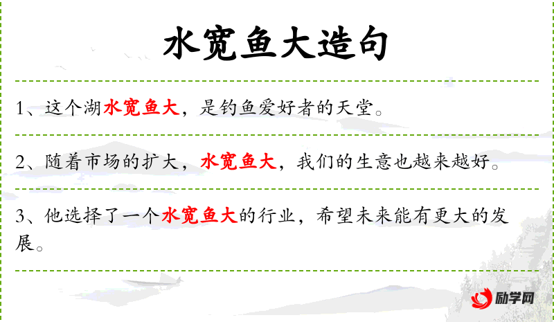 4. 【水宽鱼大】 宽:广大。水面宽的地方鱼肥大。比喻事物的发展由环境决定。