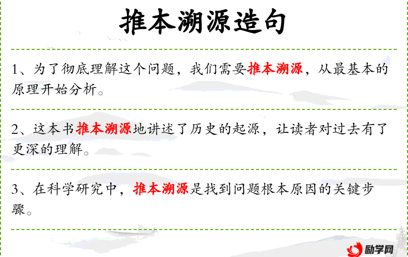 - 推本溯源:指追溯事物的根本来源,探究其起因。
