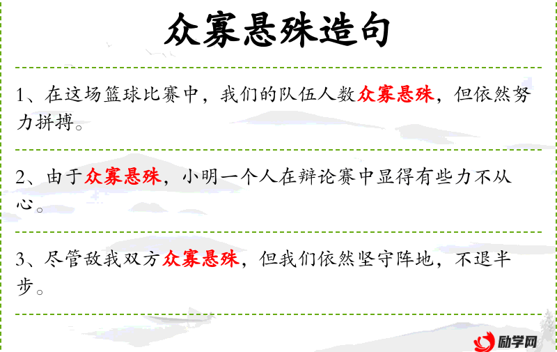 - 成语“众寡悬殊”体现了中文表达中对数量差异的描述。