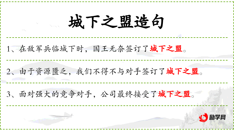 - 城下之盟:成语,原指在战争中,一方在城墙下被迫与对方签订的和约,现泛指在不利条件下被迫达成的协议。