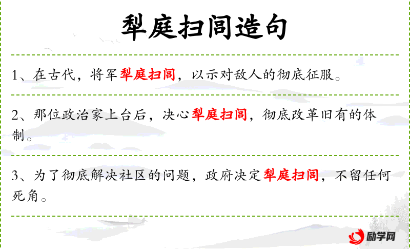 4. 【犁庭扫闾】 - 犁平他的庭院,扫荡他的村庄。比喻彻底摧毁敌方。庭:庭院。扫:扫荡。闾:里巷的门。