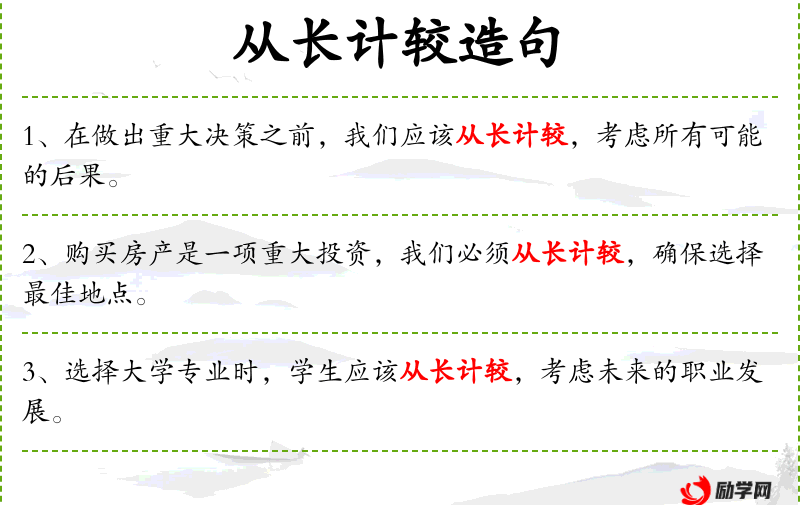 - 英文翻译中,“consider long-term implications”准确表达了“从长计较”的含义。