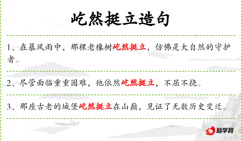 - 挺立:表示直立不倒,常用来形容人的坚定立场。